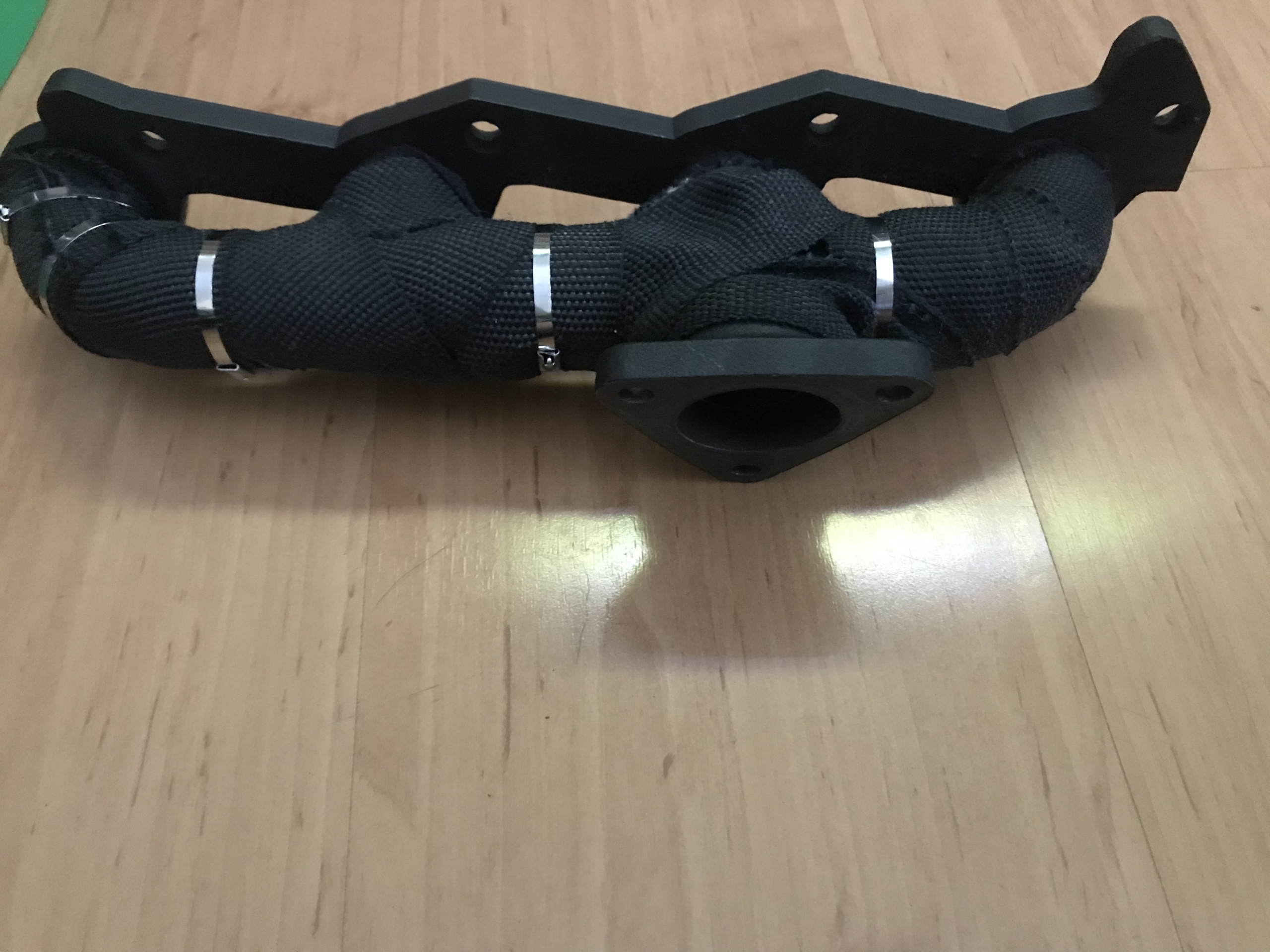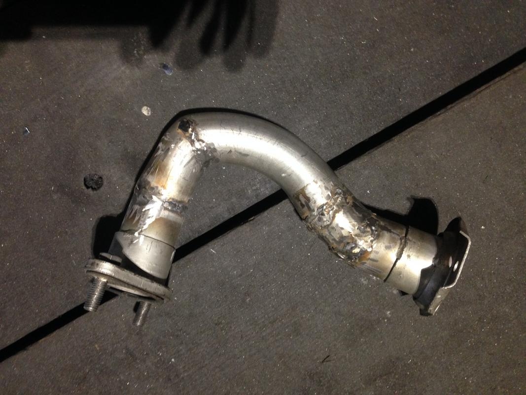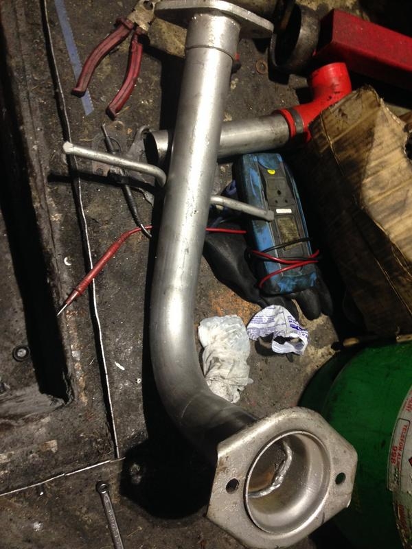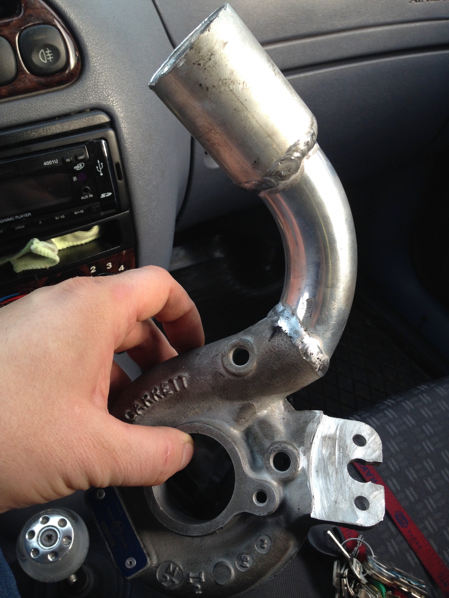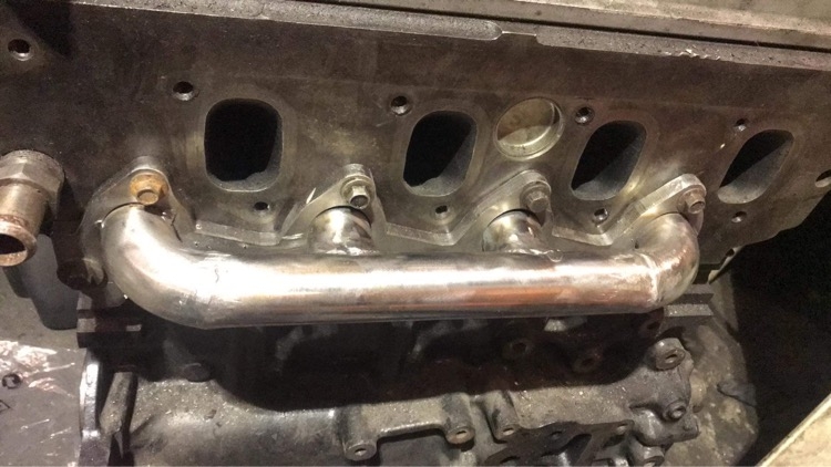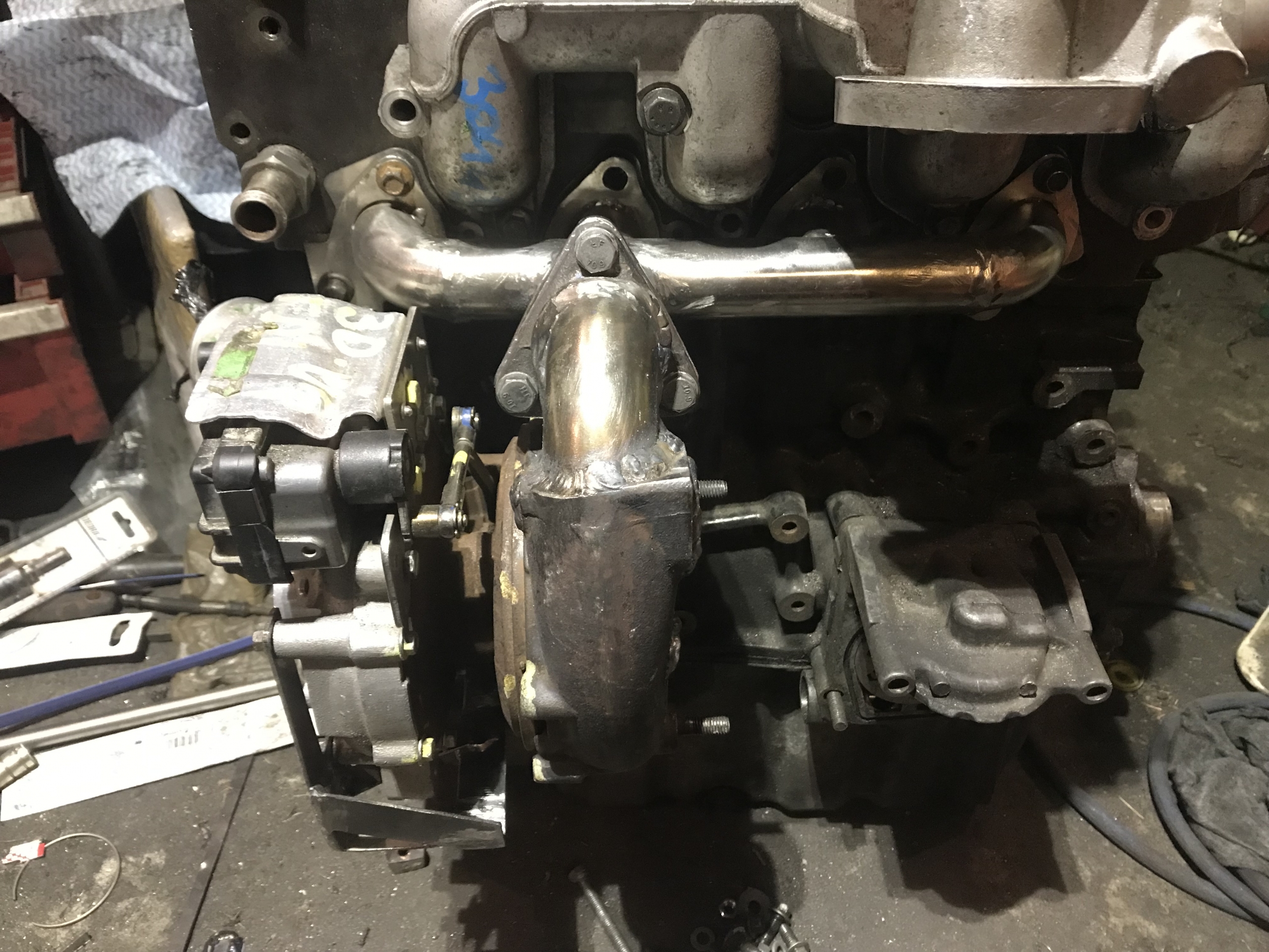 Oczywiście flansza do turbo z kawałkiem wydechu, też wyspawana od nowa, jest tam widoczny wspornik podtrzymujący rurę do bloku silnika, tak by zminimalizować naprężenia od wydechu idące na turbo: