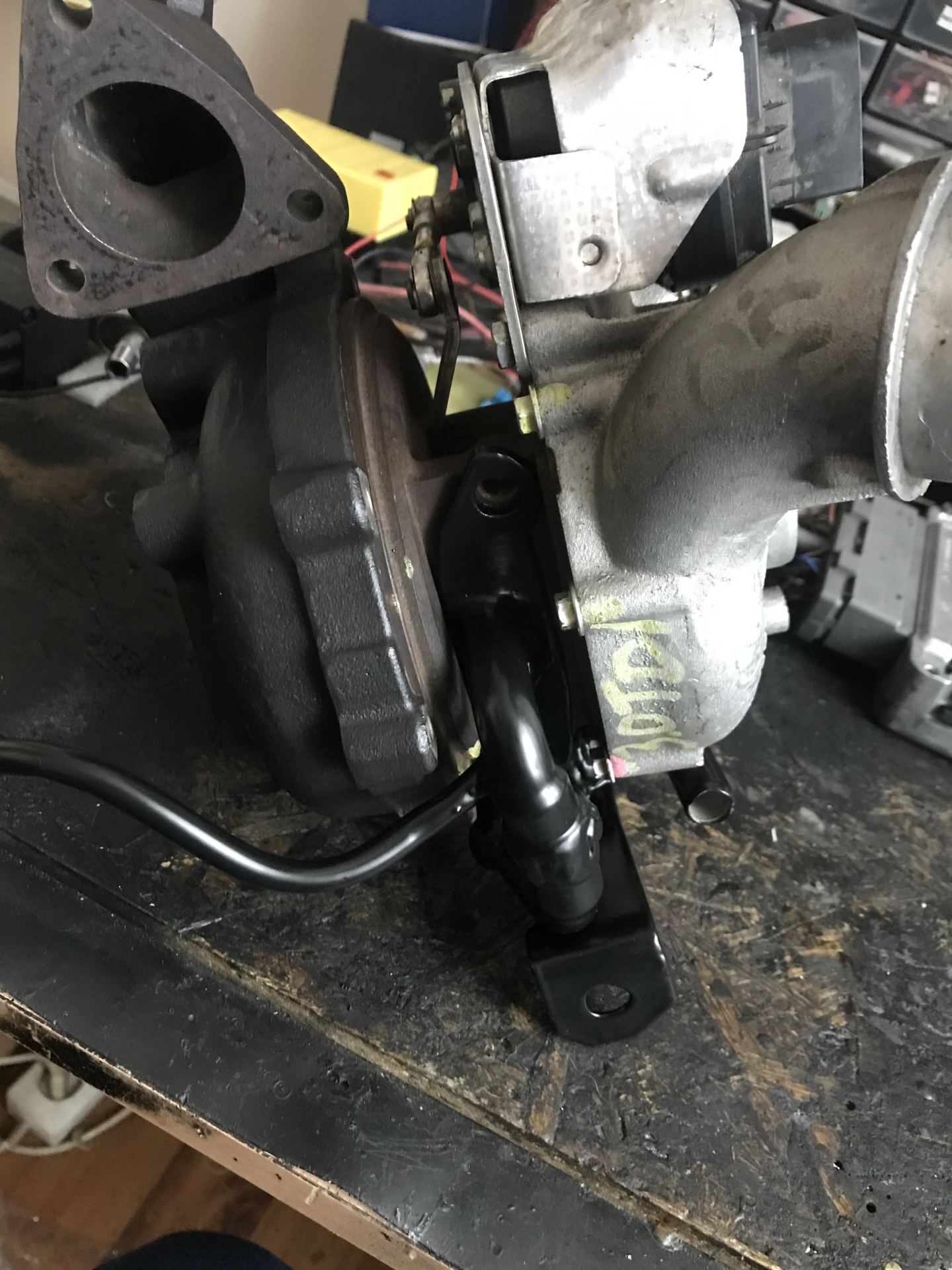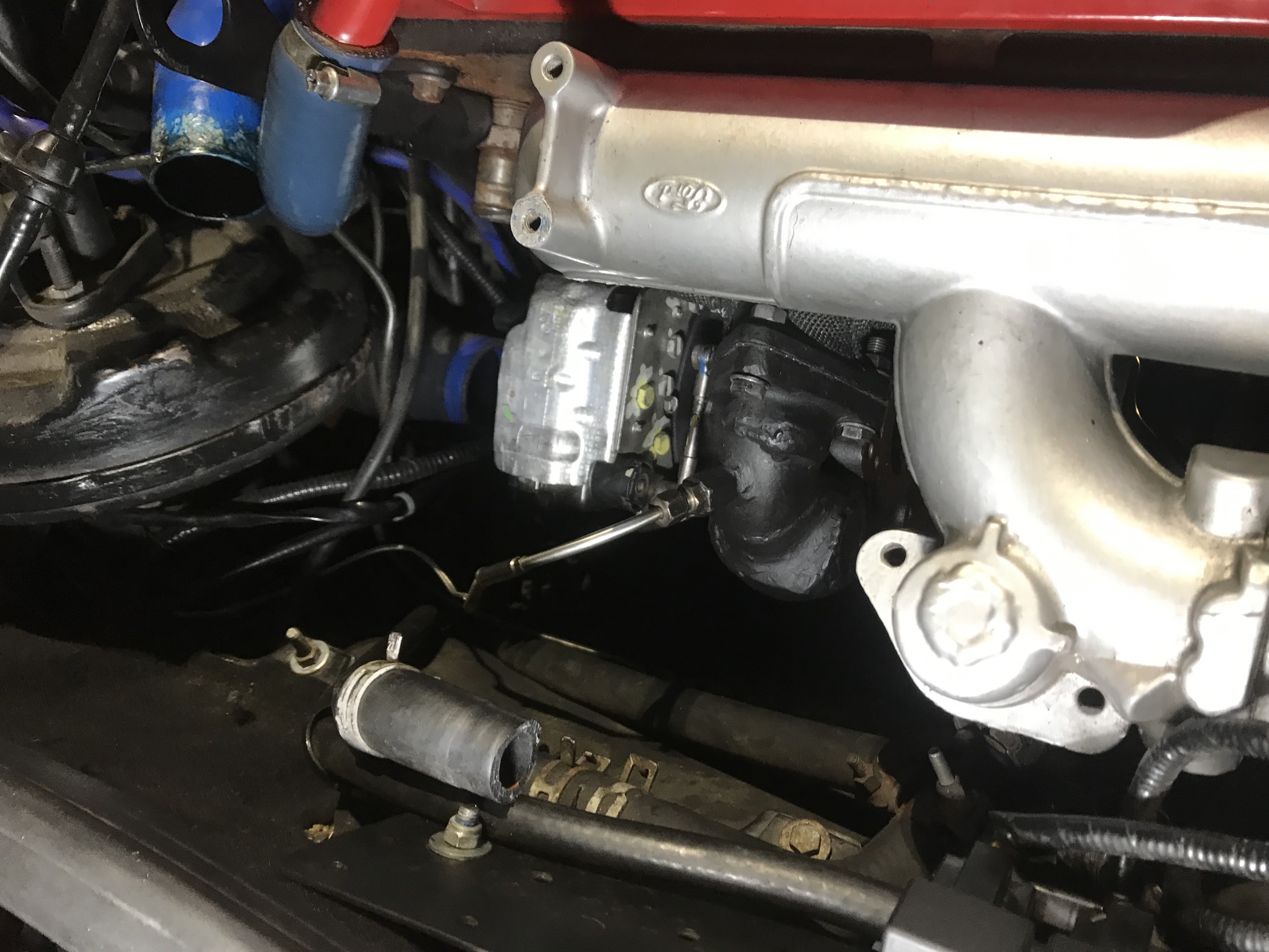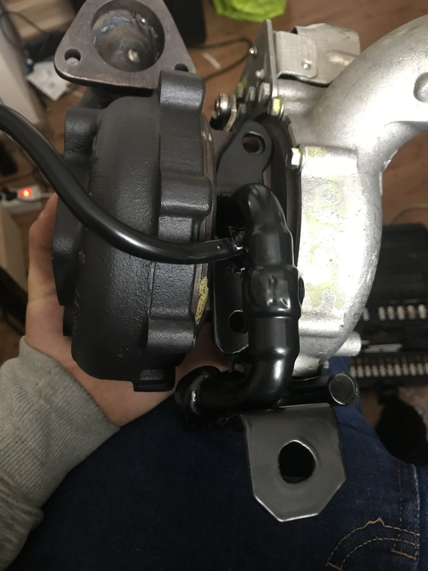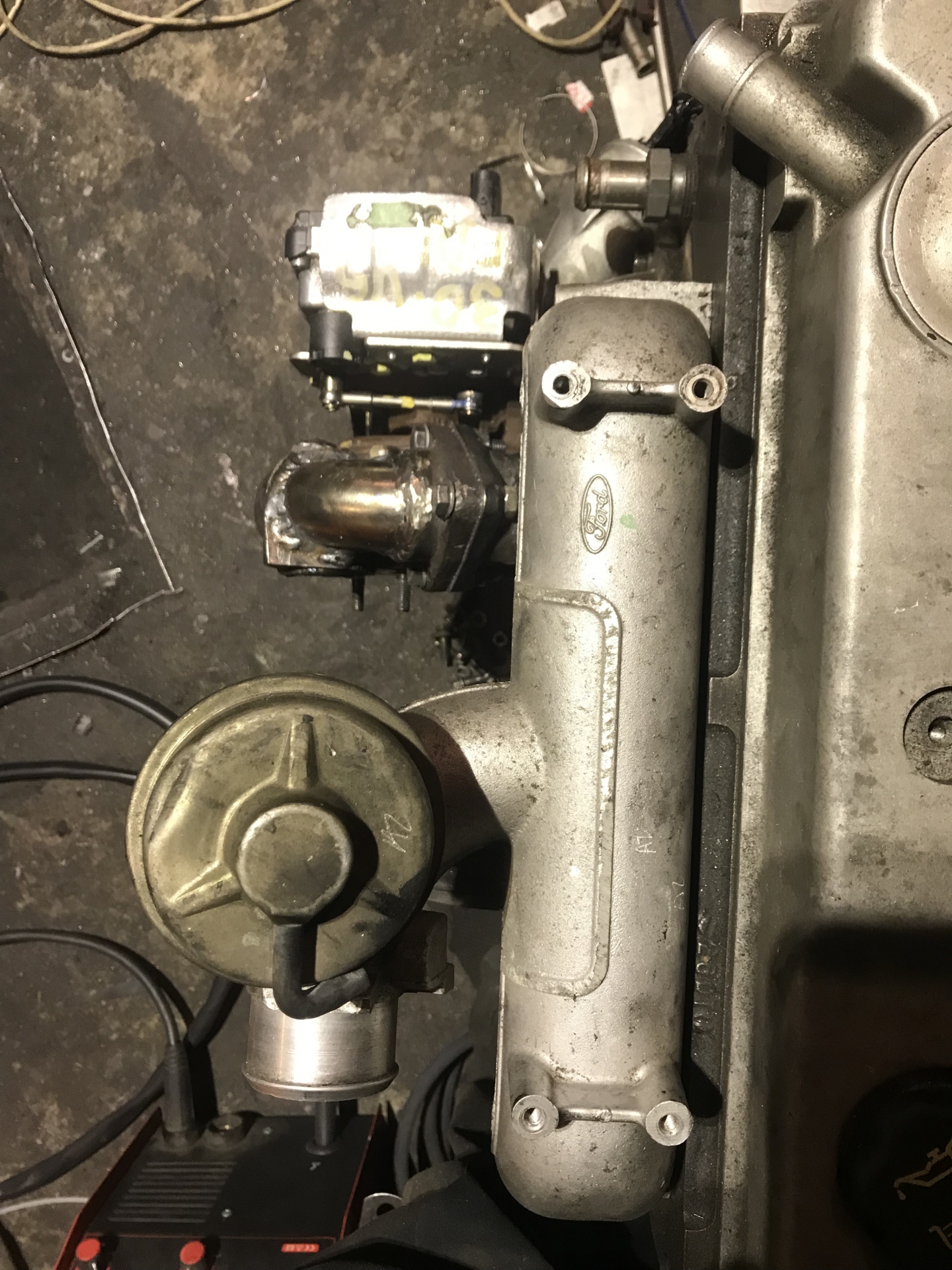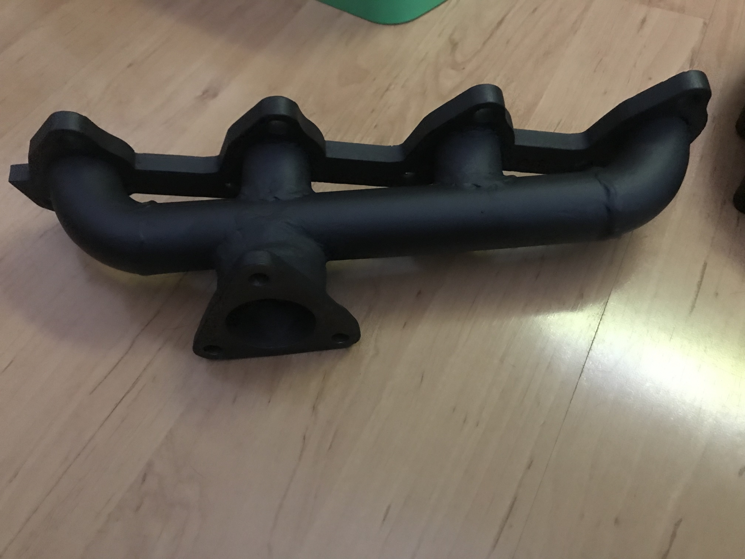 Oczywiście flansza do turbo z kawałkiem wydechu, też wyspawana od nowa, jest tam widoczny wspornik podtrzymujący rurę do bloku silnika, tak by zminimalizować naprężenia od wydechu idące na turbo: