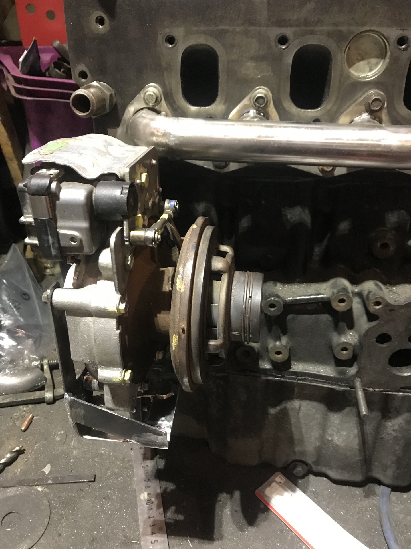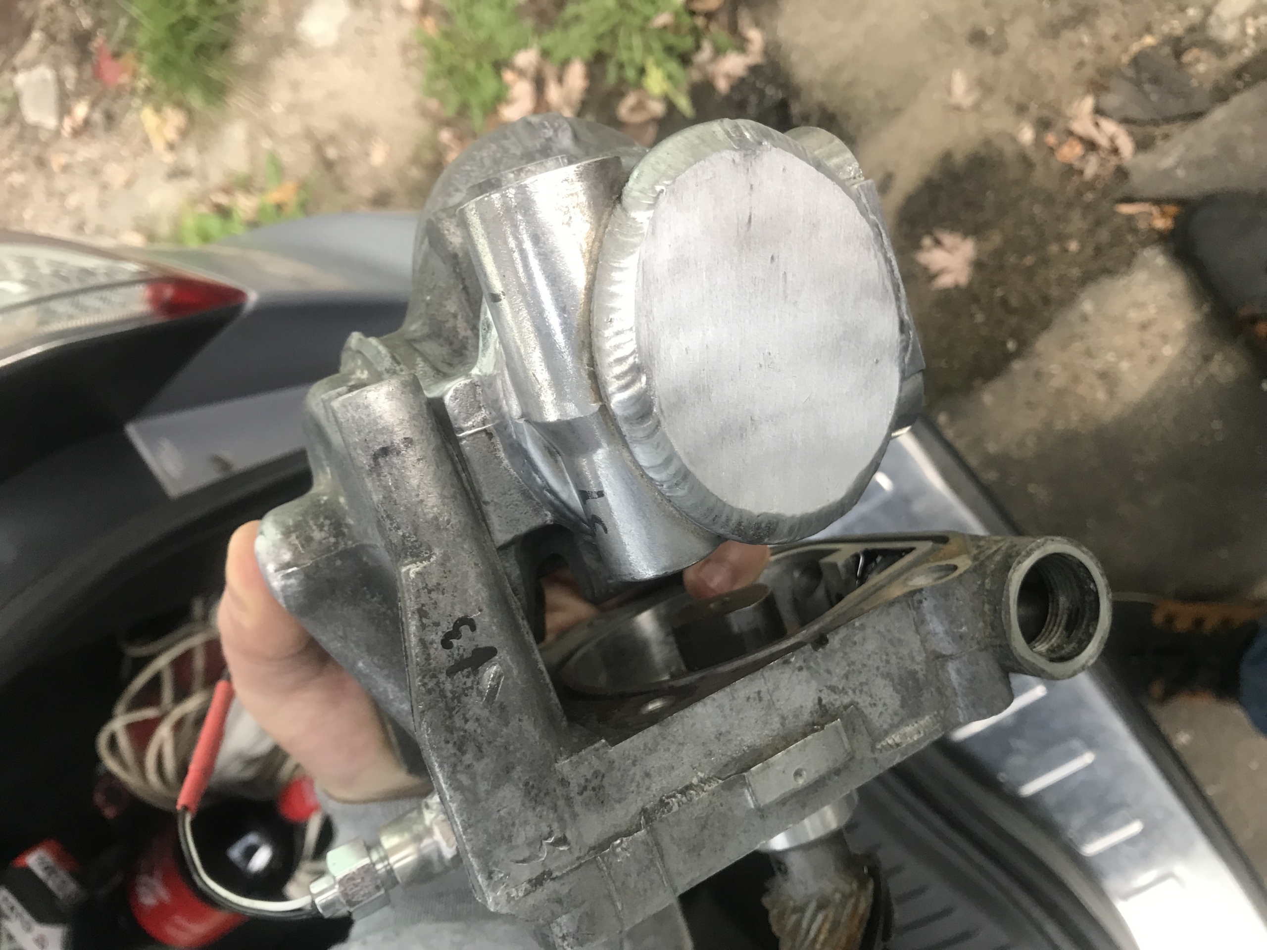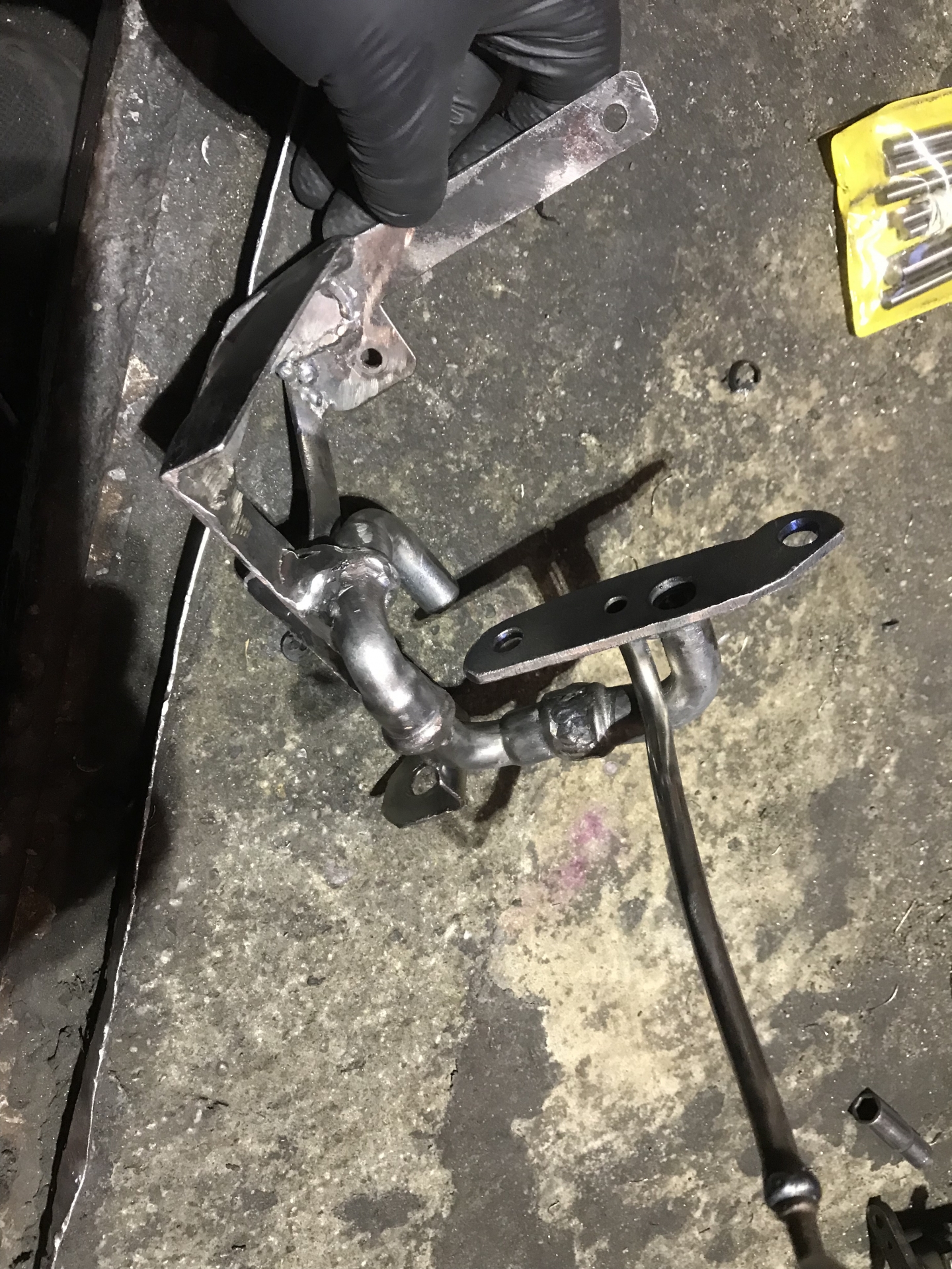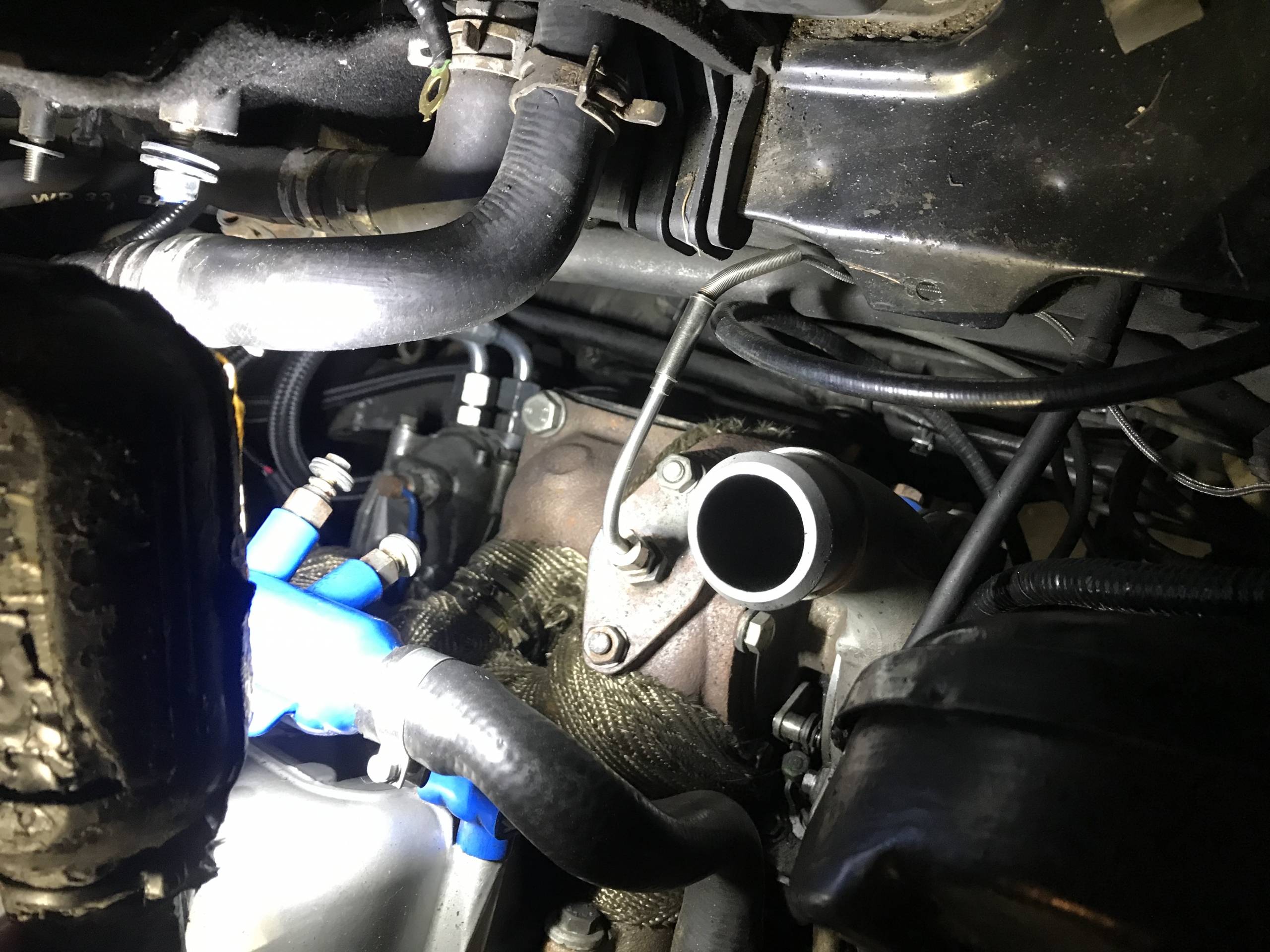 Oczywiście flansza do turbo z kawałkiem wydechu, też wyspawana od nowa, jest tam widoczny wspornik podtrzymujący rurę do bloku silnika, tak by zminimalizować naprężenia od wydechu idące na turbo: