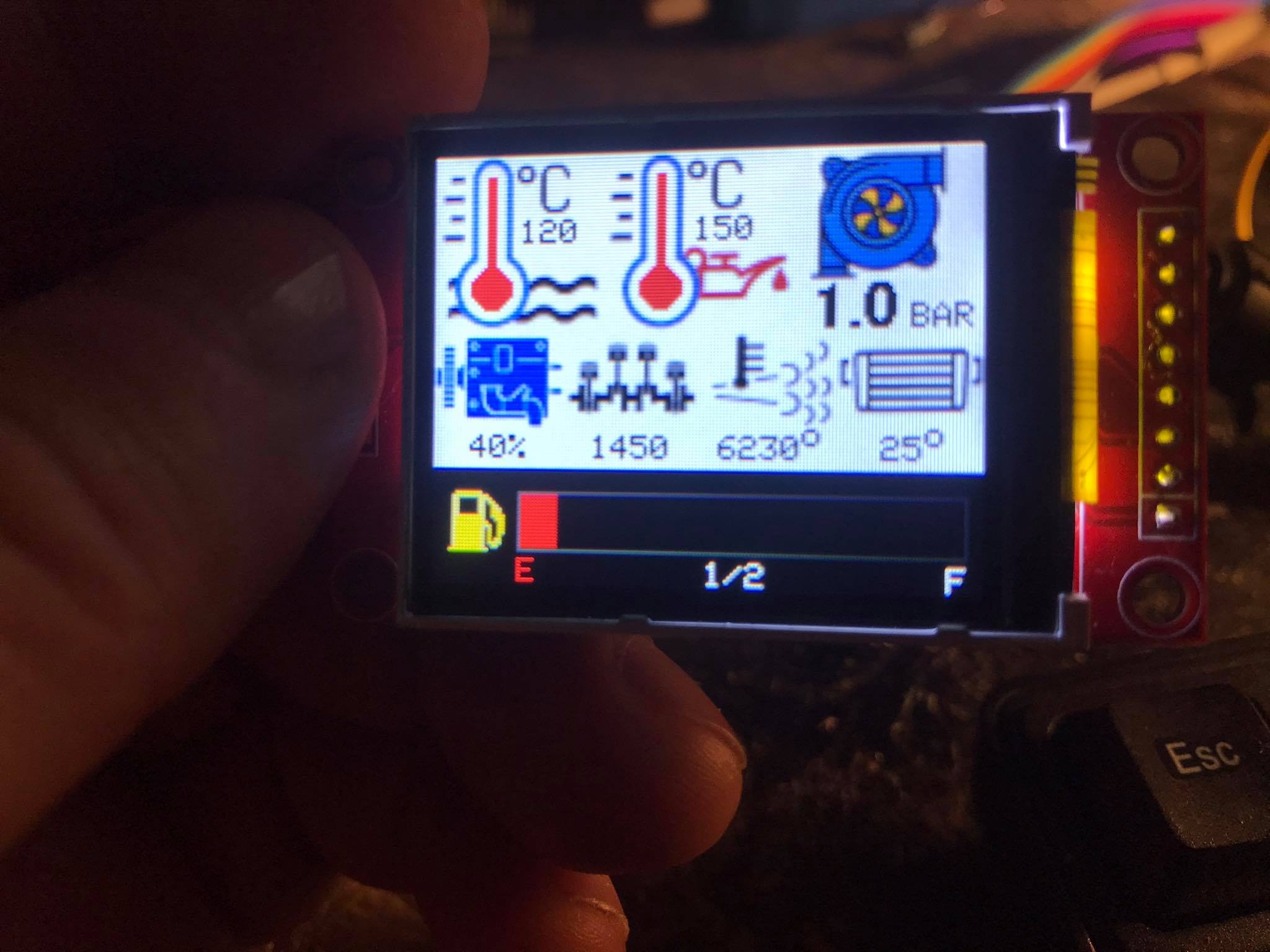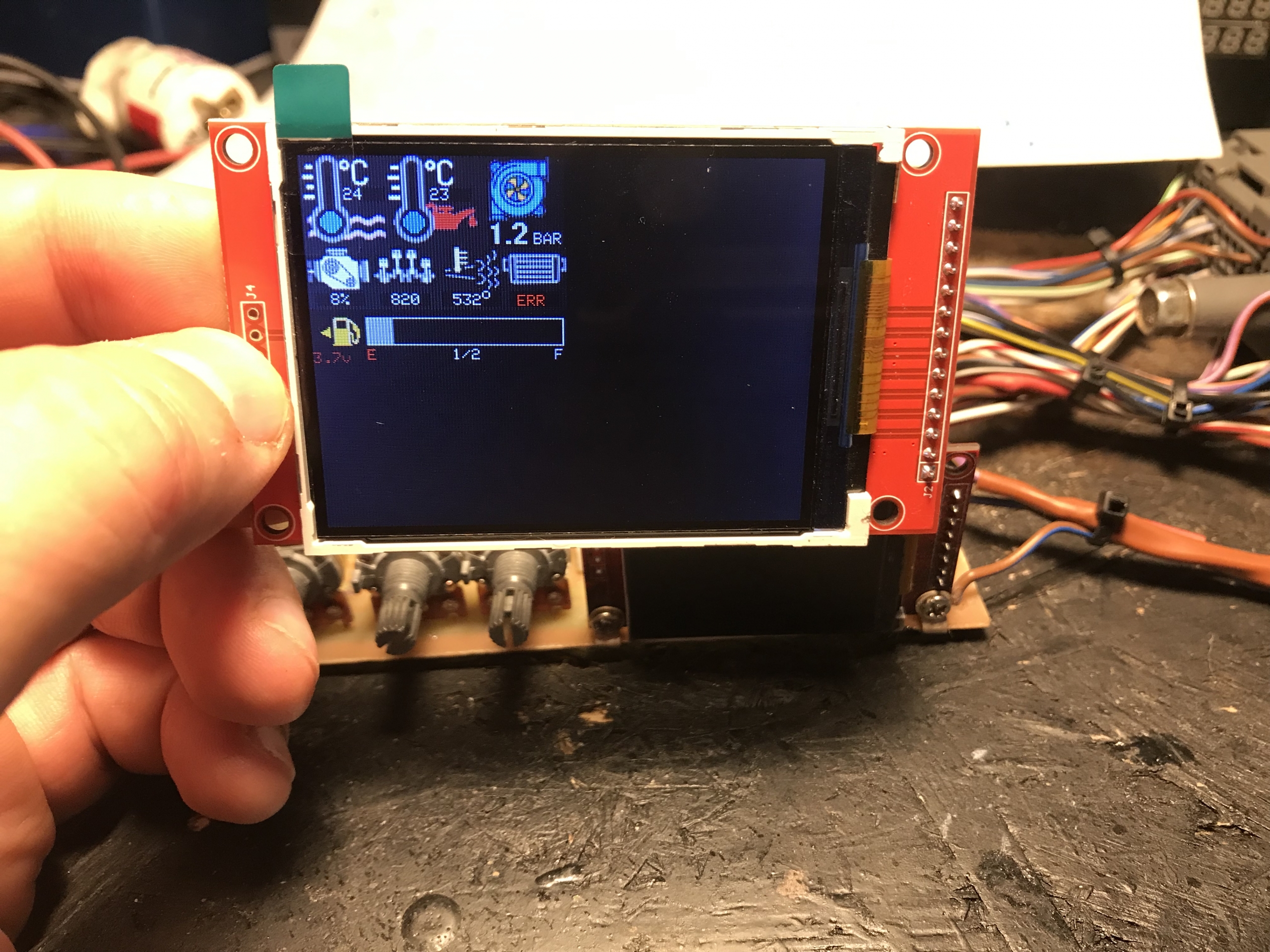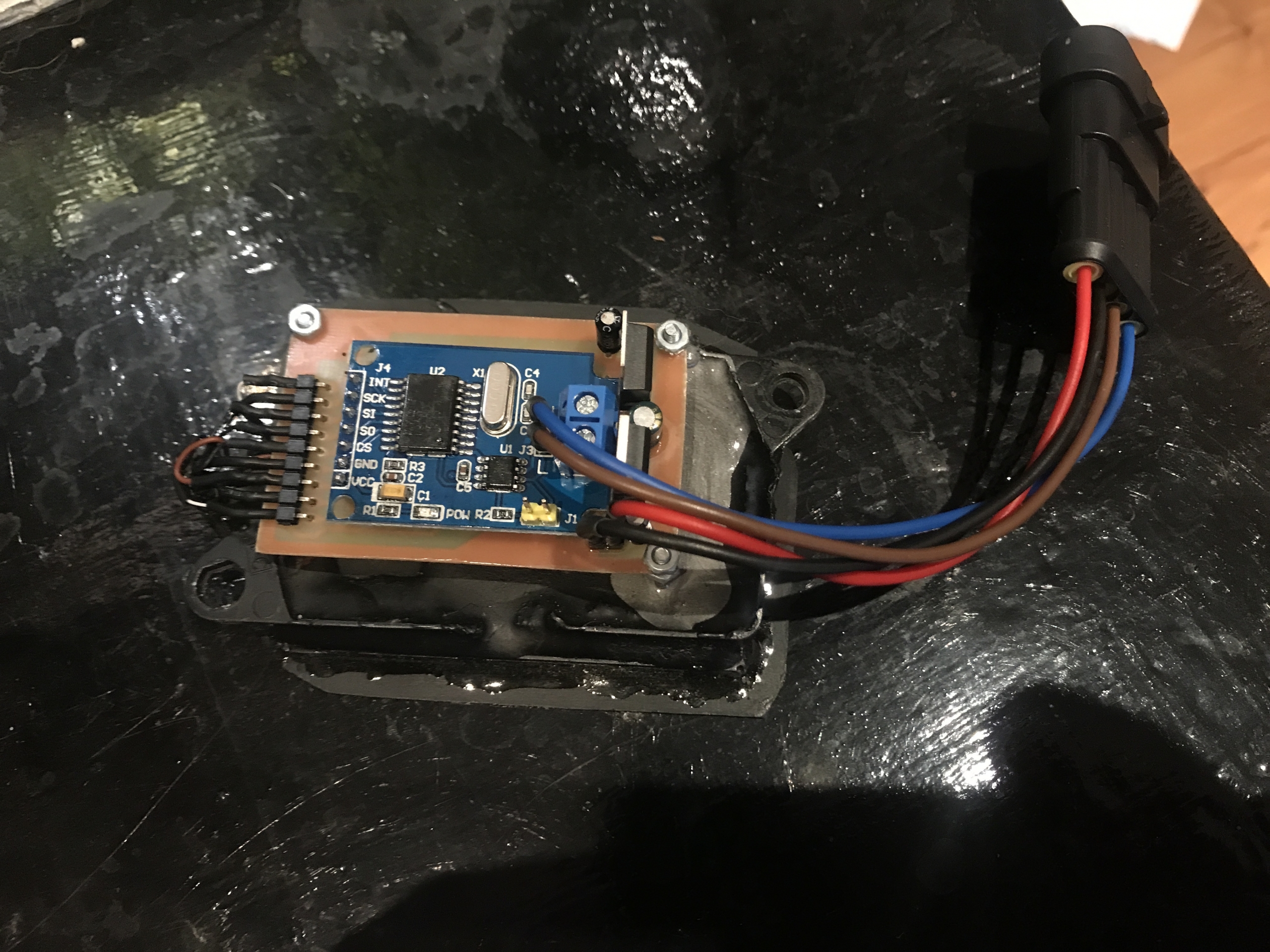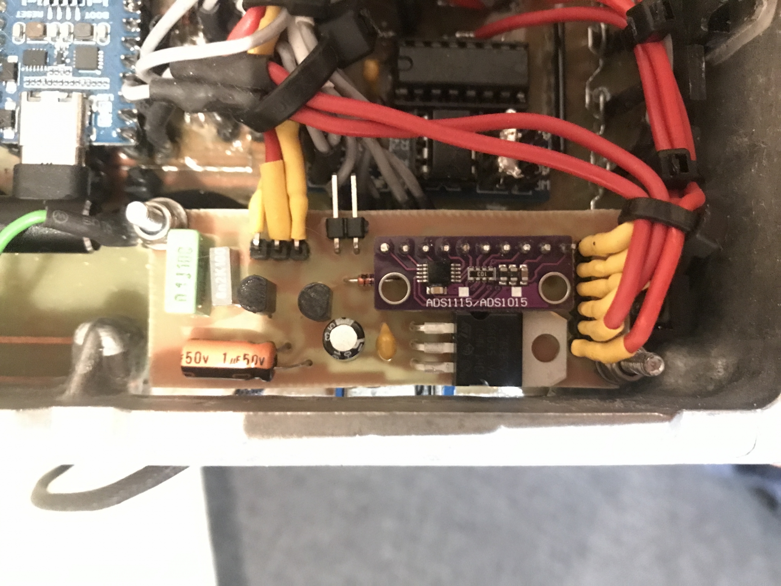 Wykorzystałem tam gotowy moduł oparty o ADS1115 (precyzyjne 16 bitowe ADC), i dodatkowo układ razem ze sterownikiem powinien działać nawet przy spadku napięcia z aku do około 8V. Jako bonus układ mierzy temperaturę paliwa za pomocą czujnika w nastawniku. Przyda się później.